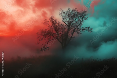 Ethereal lone tree silhouette amidst surreal fog with vibrant red and blue sky, creating a mystical and tranquil atmosphere.