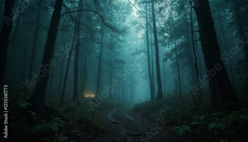 Ethereal luminescence, A tranquil pathway through a hazy forest