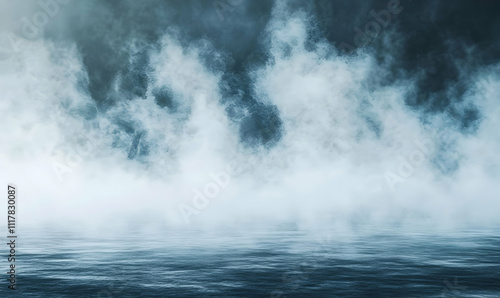 Ethereal mist shrouds a calm sea, creating a mysterious and serene atmosphere. Perfect for fantasy, mystery, or atmospheric backgrounds.