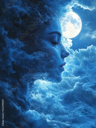 Ethereal Oceanic Portrait Serene Moonlit Face Blended with Swirling Waves