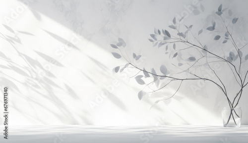 Ethereal Olive Tree Leaves Against a White Wall Enhanced by Bold Shadows and Sunrays, Green Plants in a Room , White Wall light effect. Interior Design and Home Decor.