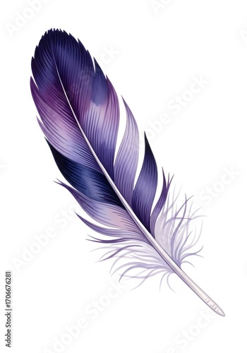 Ethereal Plumage: Hand-Painted Watercolor Feather in Deep Purple, Indigo, and Lavender Tones Against Stark White - A Study in Delicate Gradient Blending and Organic Flow!