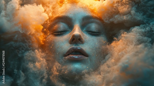 Ethereal portrait of a serene woman surrounded by colorful clouds.