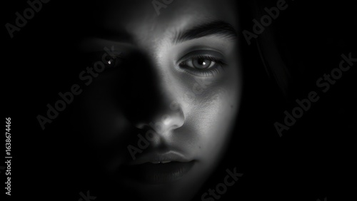 Ethereal Portrait: Woman's Face Emerges from Darkness in Monochrome