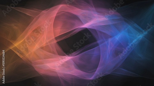 Ethereal smoke waves in pink, orange and blue colors on black background. Abstract fluid art design with smooth curves. Modern digital wallpaper with dynamic flow effect