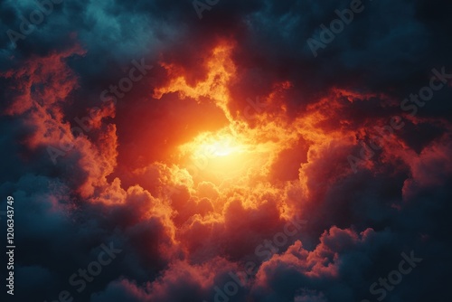 Ethereal sunset amidst dramatic clouds sky digital artwork atmospheric wide view nature's majesty
