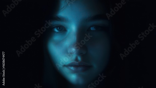 Ethereal Teal Glow Illuminates Young Woman's Face in Dramatic Low-Light Portrait