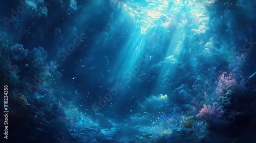 Ethereal underwater abyss with soft, cascading blue sunlight creating a peaceful, deep ocean atmosphere