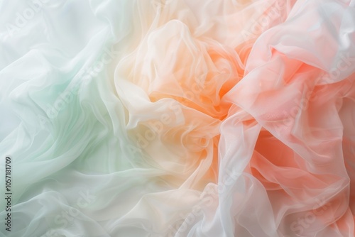 Ethereal waves of pastel fabric create a dreamy and soft visual, blending gentle hues of peach, white, and mint in a flowing, abstract pattern.