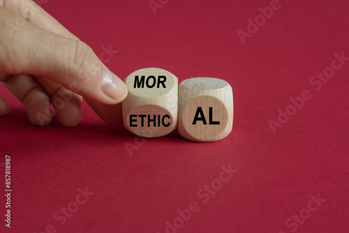 Ethical or moral symbol. Businessman turns a wooden cube and changes the word 'moral' to 'ethical' on a beautiful red background. Business and ethical or moral concept. Copy space.