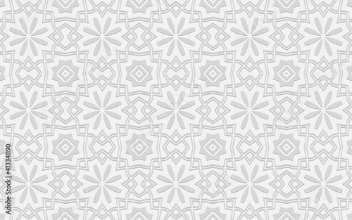 Ethnic convex volumetric wallpaper from a 3D floral pattern. White embossed background from abstract geometric shapes. Texture for presentations, fabrics, business cards.