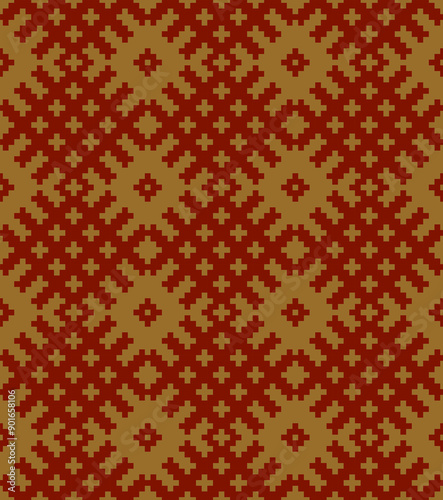 Ethnic geometric fabric pixel pattern cross Stitch. Ikat embroidery in red on gold background. Abstract vector illustration for Textile ,clothing, scarf, motifs, silk and etc.