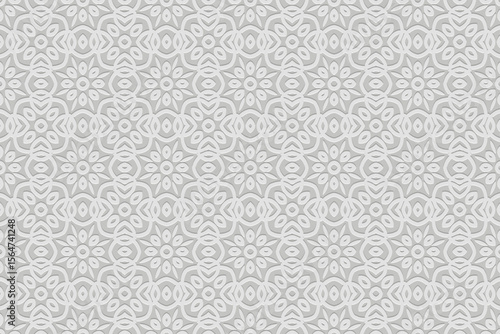 Ethnic patterned white background, cover design, banner, wallpaper. Geometric artistic boho 3d pattern, embossing. Tribal ornaments, arabesques, mandala, fresco of the East, Asia, India, Mexico, Aztec