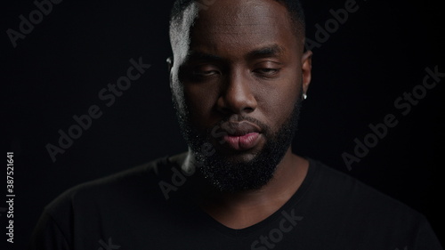 Euphoric afro guy looking at camera indoors. Male person saying wow in studio