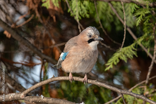 Eurasian jay, Garrulus glandarius, sitting on a branch in nature.