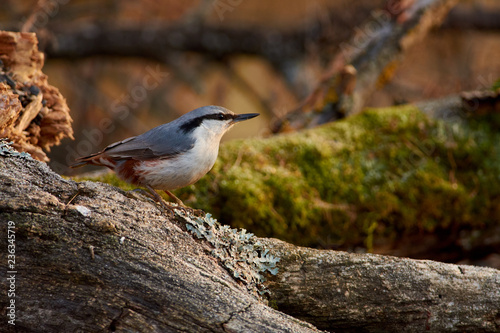 Eurasian nuthatch sits on a log with lichen on a background of autumn forest.