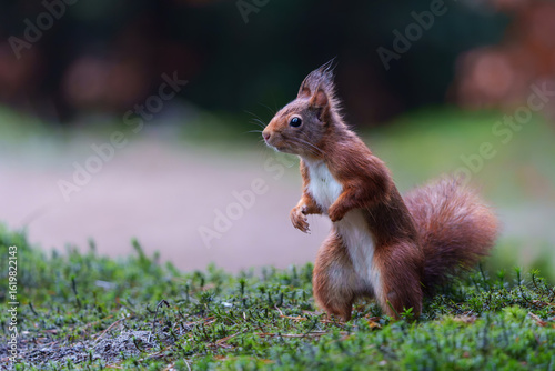 Eurasian red squirrel (Sciurus vulgaris) searching for food in the forest in the Netherlands.