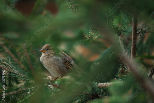 Eurasian tree sparrow sitting on tree branch with green blurred background. Sparrow on the tree