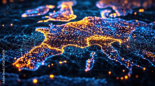 Europe night lights digital map, global network connections, data visualization, future technology, website banner