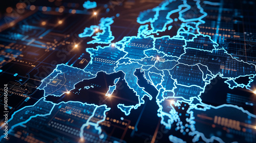 European continent map illuminated with glowing blue borders on circuit board background, representing digital transformation and technological connectivity across nations