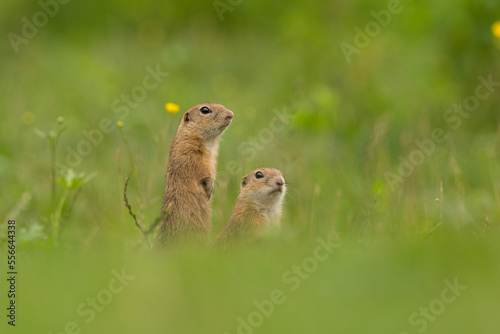 European ground squirrel on the spring meadow. Ground squirrel is peeping from the grass. European nature. Small brown rodent live in the big groupe.