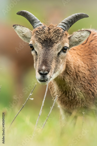 European mouflon (Ovis aries musimon), with beautiful green coloured background. Amazing mammal with brown hair near the forest. Wildlife scene from nature, Czech Republic