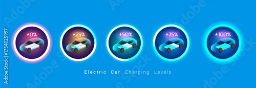 EV Battery Charge Progress Icons, Electric Car Charging Levels 0 to 100 Percent, Futuristic Neon Dashboard UI Concept