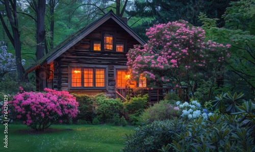 Evening glow illuminating the facade of a stylish wooden cabin nestled among blooming azaleas and rhododendrons in a spring garden