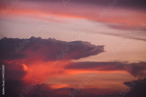 Evening sky sunset. big puffy cumulus and long stratus clouds. sky background with clouds
