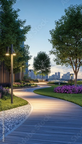 Evening stroll through a landscaped walkway, modern cityscape in the background.