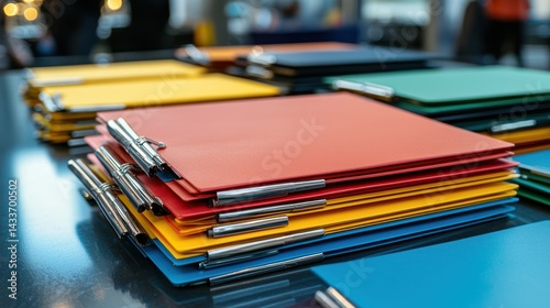 Event-themed clipboards stacked on a promotional table