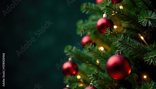 Evergreen Christmas tree with scattered ornaments and dimly lit branches, Festive Atmosphere, Evergreen Branches