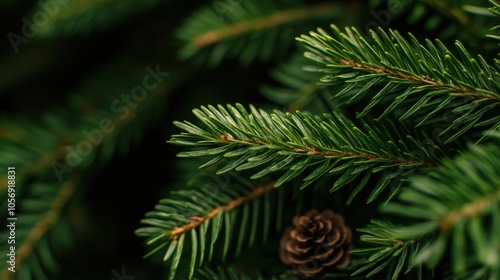 Evergreen Pine Tree Branches with Pine Cone Closeup Christmas Nature Background