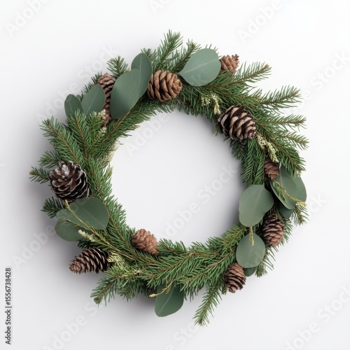 Evergreen Wreath with Eucalyptus and Pinecones on a Clean Background