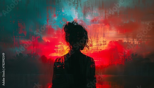 Evoke a sense of mystery with a rear view digital rendering in glitch art style, delving into the concept of cognitive dissonance Experiment with unexpected camera angles to create a disorienting yet