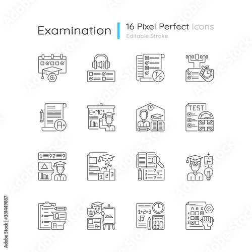 Examination tests pixel perfect linear icons set. Exam paper with answers. Studying, education. Customizable thin line contour symbols. Isolated vector outline illustrations. Editable stroke