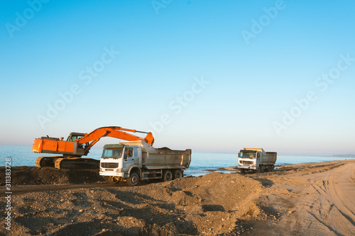 Excavator loads the excavation onto a truck (hydraulic)are heavy construction equipment consisting of an arrow,a bucket and a cabin on a rotating platform.On the beach with the sea and the setting sun