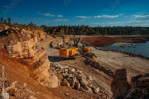 Excavators working on limestone mining in the flooded quarry