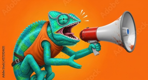 Excited chameleon holding a megaphone announcing something important with open mouth