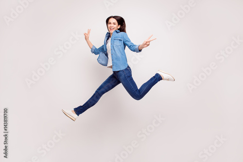 Excited happy pretty girl in casual jeans clothes high jump with raised hands and legs, on white background