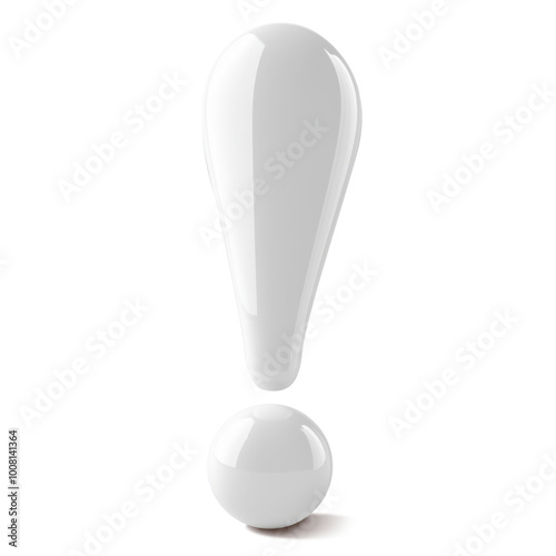 Exclamation mark isolated on white background. White exclamation mark - accent symbol, means of attracting attention. Simple 3d render, glossy material.