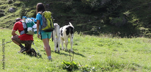 Excursionists and cows on the mountain