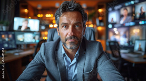 executive giving an online conference from his office, the man is facing the way viewers would see him