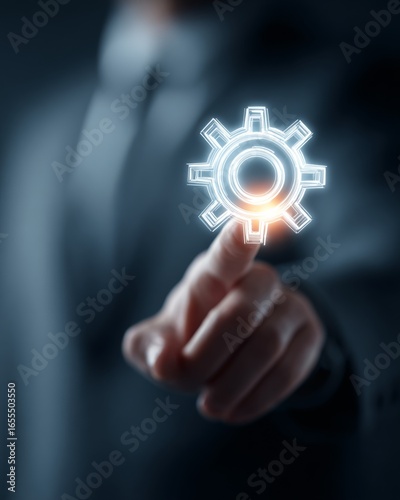 Executive hand pointing at a glowing holographic gear icon, symbolizing technology, innovation, and business process optimization.