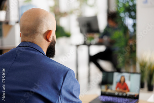 Executive manager discussing start up project with investor on laptop in business office. Entrepreneur listening to woman business partner presenting idea in video conference