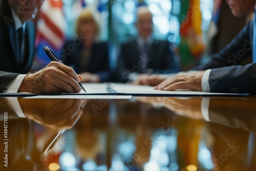 Executives participating in international agreement signing event in conference room, focusing on hands holding pens and documents against blurred background