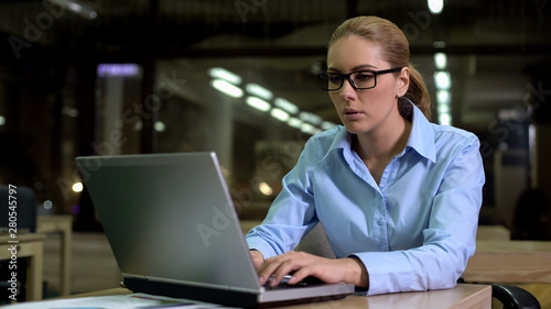 Exhausted business lady with eyesight problems looking at laptop in office
