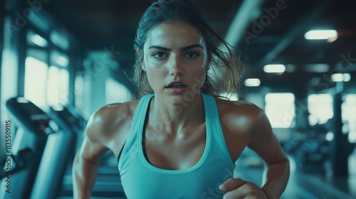 Exhausted woman running on treadmill in gym, showcasing dedication and effort in workout