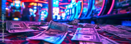 Exhilarating scene of money falling like confetti in a lively casino setting with bright lights and gaming action.