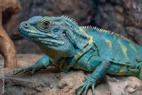 Exotic iguana poop on a rock within a controlled environment like a zoo or sanctuary.